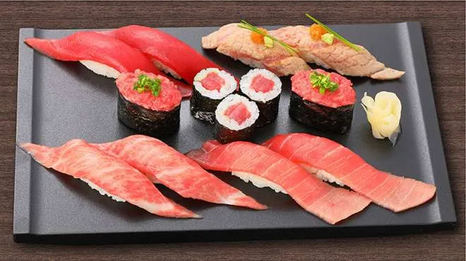 На фото вверху – все варианты суши с тунцом. Сверху слева – суши с обычным сырым тунцом, справа – с прижаренным, снизу слева – суши из самой жирной части тунца, “ооторо”, а рядом – суши из чуть менее жирной части, “тюторо”. По центру – суши-”гункан” с рубленым тунцом (“гункан” легко узнать – их оборачивают водорослями нори так, чтобы суши по форме напоминали лодочку) и хосомаки с тунцом.