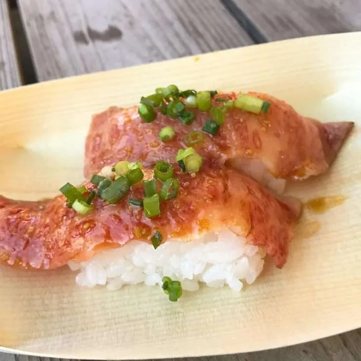 А есть еще и мясные суши (они встречаются в регионах, которые славятся говядиной). Мясо там сырое, но все же опаленное огнем.