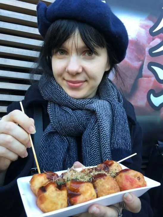 В самом простом виде такояки — шарик из теста с кусочком отварного осьминога внутри (“тако” в названии — “осьминог”, “яки” — слово, образованное от “яку”, жарить). Тесто в такояки имеет другую консистенцию по сравнению, скажем, с пирогами. Снаружи у шарика — золотистая корочка, а вот внутри он остается слегка вязким (но, конечно, есть его совершенно безопасно). За пределами Японии такояки любят пропекать вусмерть, чтобы жидкое тесто не смущало умы вкушающих — мне больше нравится японский вариант. Иногда в такояки подмешивают мелко нарезанный зеленый лук, иногда — “тенкасу”, хрустящие кусочки теста для темпуры, обжаренного во фритюре, или еще какие-нибудь добавки вроде нашинкованных кусочков маринованного имбиря.