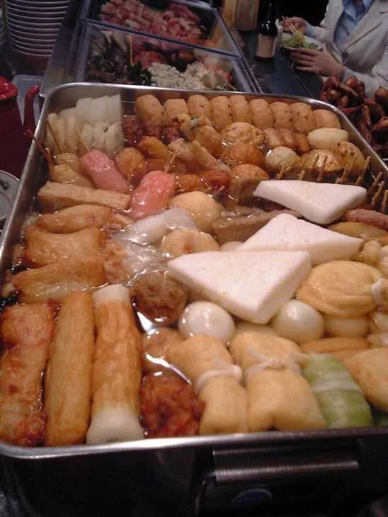 Одэн узнать легко – в миске с прозрачным бульоном даси плавают куски чего-то непонятного, смутно напоминающего овощи в тесте. Все это медленно томят на огне, чтобы холодным зимним днем можно было выловить это непонятное, съесть и согреться. Обычно среди компонтентов есть тофу с поджаристой корочкой и сероватые желеподобные кусочки растения “конняку”. Еще можно увидеть “сиратаки” – белую лапшу из конняку и “ханпен” – белые треугольнички, которые делаются из рыбного фарша сурими, натертого японского горного ямса и яичного белка. Овощи в миску тоже попадают – например, большие куски дайкона (японской редьки), морковки или роллы из капусты. Иногда в миску попадает яйцо, куриные тефтельки, жареные медальончики из сурими и муки. Бывает, что заплыв совершают сосиски.