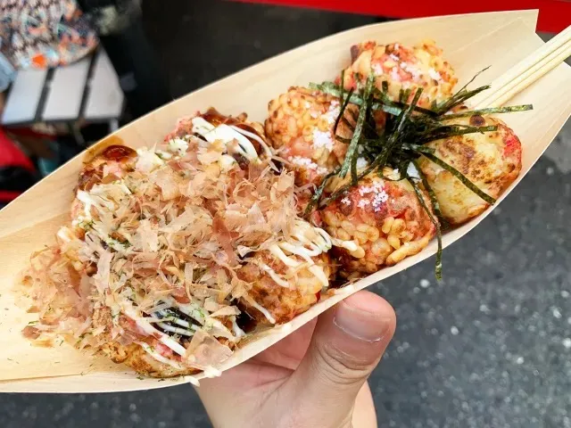 Поштучно такояки не продают, только наборами по 6 или 8 штук. Их выкладывают на специальную тарелку-”лодочку”. По умолчанию сверху льют сладковатый соус для такояки (он коричневого цвета). Есть опциональные добавки — например, можно попросить полить такояки майонезом или посыпать стружкой тунца-бонито (по-местному “кацуобуси”), она смешно шевелится от тепла, которое источают свежеиспеченные такояки. Есть такояки предполагается с помощью зубочисток (нанизываете на нее шарик, как на шпажку, и съедаете) или палочек (такояки мягкий и его удобно сжимать ими) — кому как удобно. Свежеприготовленные такояки бывают обжигающе горячими внутри, поэтому я стараюсь не набрасываться на них сразу же, как только повар отдаст лодочку. Это сложно :)