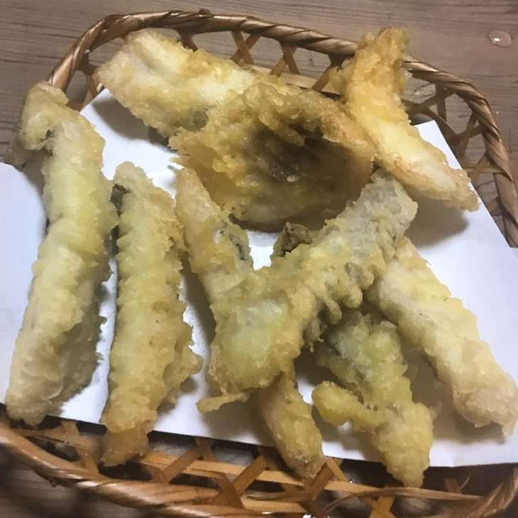 Овощи, рыба или морепродукты в кляре — это все темпура. Кусочки баклажанов, сладкого перца, спаржи или целые креветки обмакивают в жидкое тесто и жарят в масле. Тесто стараются замешивать не слишком тщательно и небольшими порциями, чтобы не испортить характерную для темпуры текстуру кляра — он получается воздушным и хрустким. Также следят, чтобы масло при жарке не пропитывало кляр, поэтому темпура мало похожа, например, на чебурек.