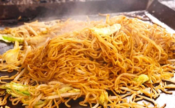 Блюдо, в котором лапша есть, а бульона нет. Лапша обычно берется та же, что и для рамена – из пшеничной муки и с небольшим содержанием “кансуи”. Ее обжаривают в масле (например, оливковом), добавляют обжаренные овощи (расхожий вариант – капуста) и кусочки мяса и заправляют сладковатым темным соусом, похожим на вустерский. Лапши в Японии не жалеют, и получается дешевая сытная еда. Ее обычно продают в недорогих забегаловках – нередко там же, где рамен.