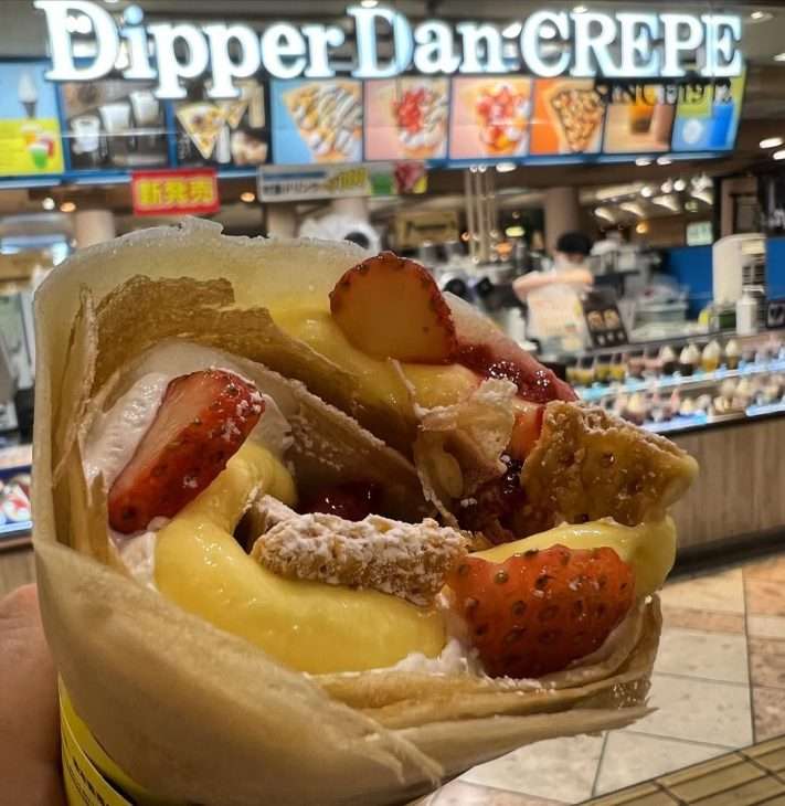 Блинчики предполагается покупать и съедать рядом с точкой, где их продают, потому что там будет урна для оберток. В Японии нет урн на каждом шагу, они обычно ставятся там, где есть еда, от которой может образоваться мусор (бак для банок у автоматов с напитками, урна для оберток у лотка с такояки и так далее). А у блинчиков как раз остается обертка, в которой вы их держите.
