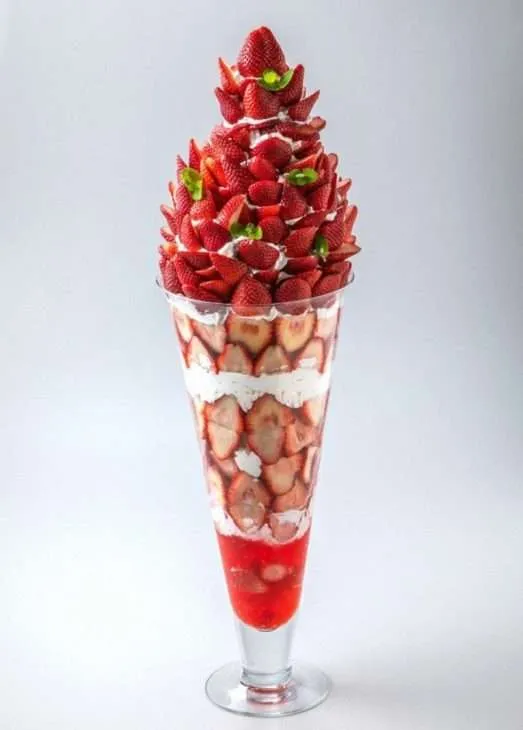 Японское парфе – это целая гора из мороженого, кусочков фруктов, шоколада, взбитых сливок и тому подобного, которую подают в прозрачном высоком стакане. Созерцать разноцветные слои – часть развлечения, витрины с образцами парфе – одни из самых фотогеничных в Японии.