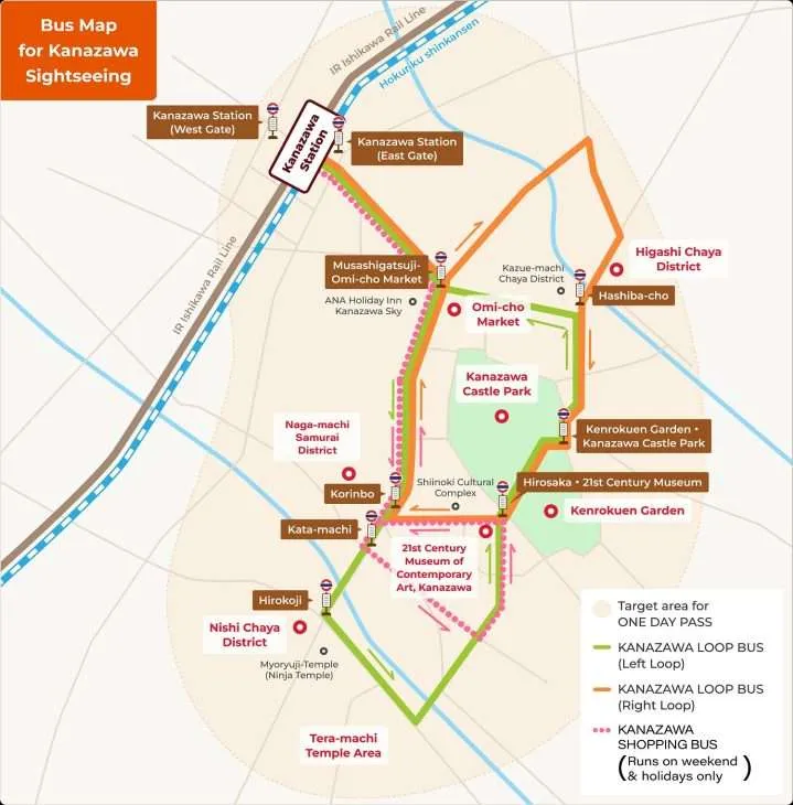 К сожалению, все интересные места разбросаны по всему городу, поэтому не получится жить «в центре» и гулять везде пешком. Кроме того, все же в Канадзаве обычно селятся на 1-2 дня транзитом, поэтому как ни крути, а отель здесь точно надо брать прямо у вокзала. До всех нужных достопримечательностей можно удобно доехать на местных автобусах (пешком идти час-два и через довольно унылые кварталы, поэтому не надо так делать). Особенно полезен Loop Bus (объезжает все основные локации), можно даже за 800 иен купить проездной на него в кассе компании Hokutetsu на вокзале. Все поезда и междугородние автобусы тоже идут именно от станции Канадзава.