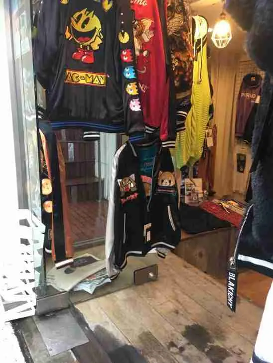 На самой улице Такесита-дори – тоже субкультурная одежда, только не брендовая и с привкусом рынка, эдакая сувенирная версия для совсем уж неопытных туристов в стиле «я был в Японии», и шопиться тут незачем. Такие лавочки разбавлены сетевыми магазинами женского белья, носков, бижутерии и косметики — в основном, ориентированными на подростков и молодежь. Еще тут же на Такесита-дори торгуют нарочито японскими и нарочито иностранными сувенирными футболками и худи вперемешку с обычными мужскими джинсами и рубашками.