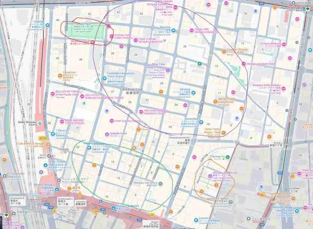 Зеленым на карте обозначена условно приличная часть, оранжевым – Golden Guy, фиолетовым – район хост-клубов, лав-отелей, ночных клубов и прочего разврата, а красным – парк Окубо (печально известен нелегальной уличной проституцией, лучше держаться от него подальше).