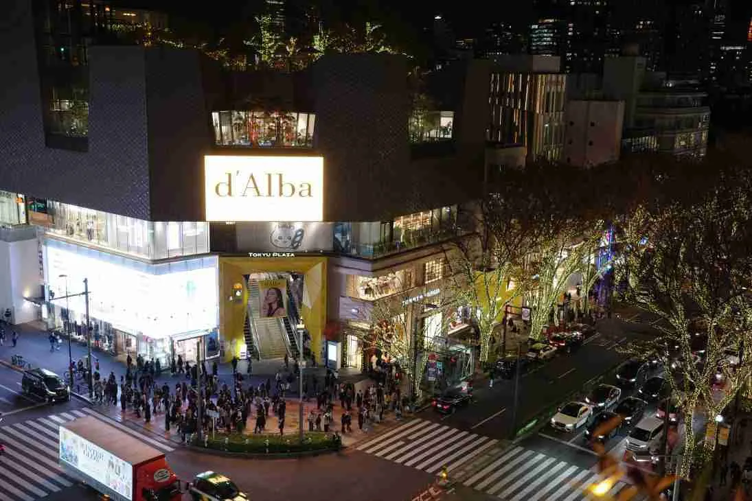 - со смотровых площадок в разных торговых комплексах вокруг (например, из бесплатной Sky Lounge на 11 этаже молла Shibuya Hikarie открывается отличный вид).
